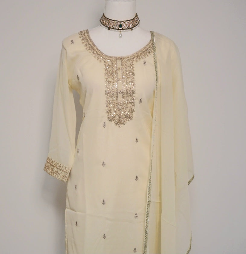 This is a beautiful white salwar set with light silver and gold embroidery. The neckline has detailed work that adds an elegant touch and the sleeves and hem are finished with matching embellishments. It comes with a soft dupatta featuring a subtle shimmery border. Overall, it’s a graceful and lightweight outfit perfect for festive or casual occasions.