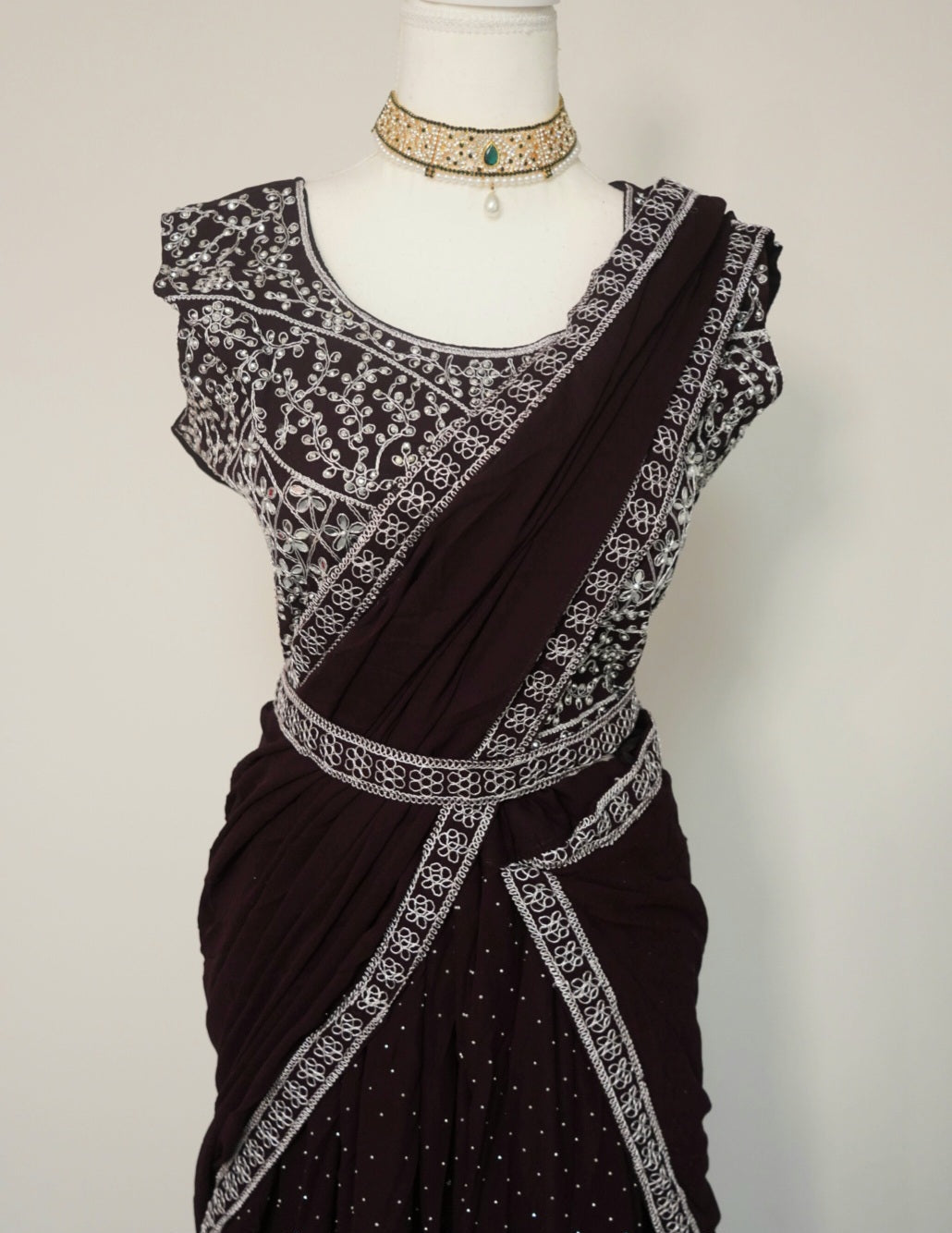 Drenched in a deep dark purple, this lehenga set is a perfect blend of tradition and modern sophistication. The blouse features intricate silver thread embroidery, delicately crafted into floral and geometric patterns that shimmer subtly against the dark fabric. With its elegant neckline, it brings a regal yet contemporary charm to the ensemble.
