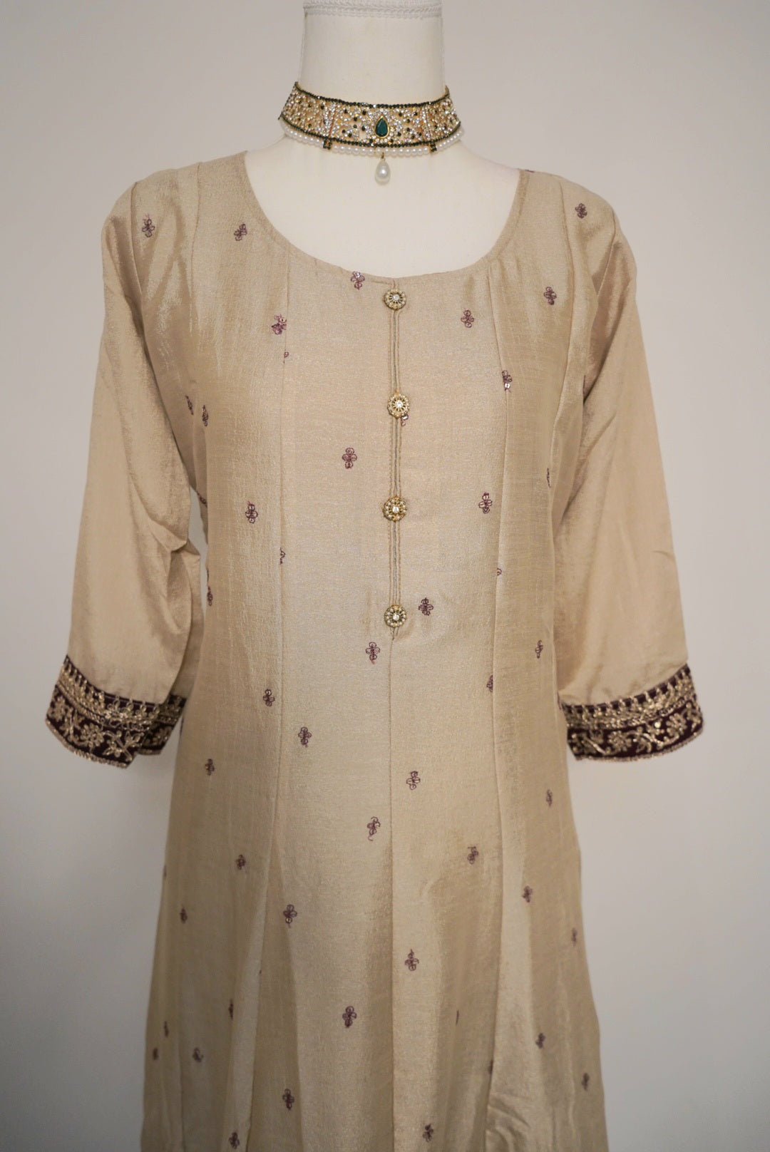This is a beautiful beige salwar set with delicate embroidered motifs and elegant button detailing on the front. The sleeves and hem feature intricate border work that adds a rich traditional touch. It comes with a deep maroon dupatta, finished with a matching embroidered border, giving the outfit a classy and graceful look. Perfect for festive functions, family gatherings or traditional events.