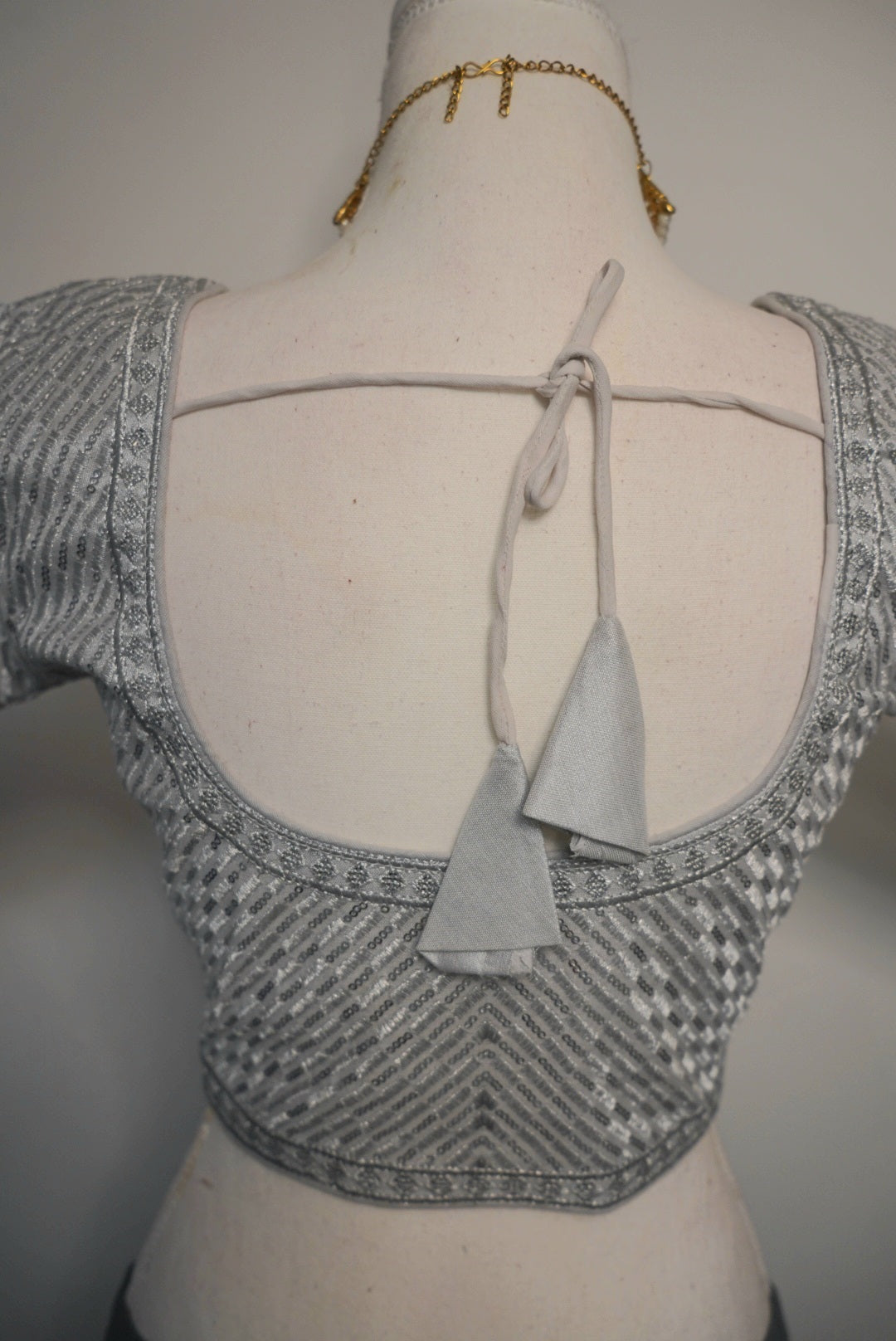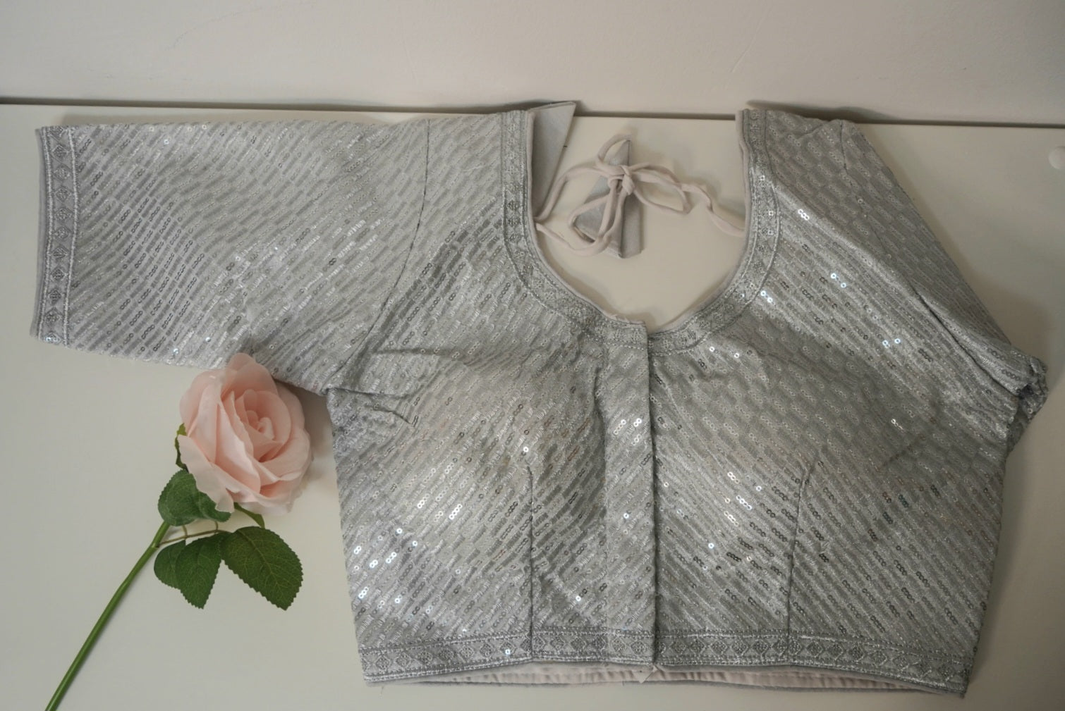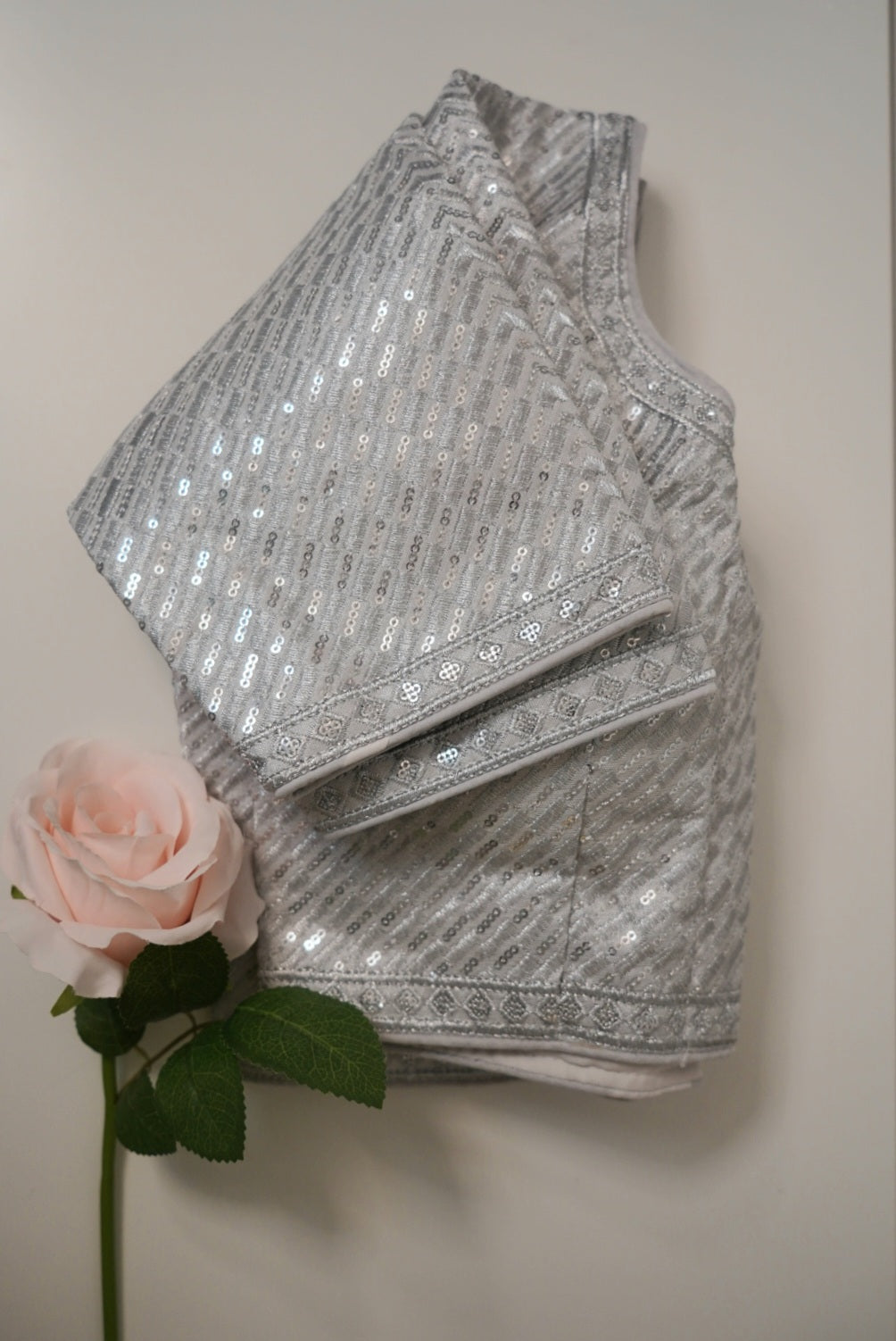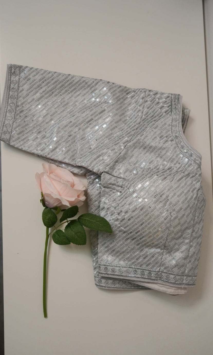 This elegant silver blouse features a shimmering sequin pattern that adds a soft, sophisticated sparkle. Designed with a subtle texture, it offers a modern yet graceful look. The sleeves and borders are finished with delicate woven detailing, enhancing its refined charm.