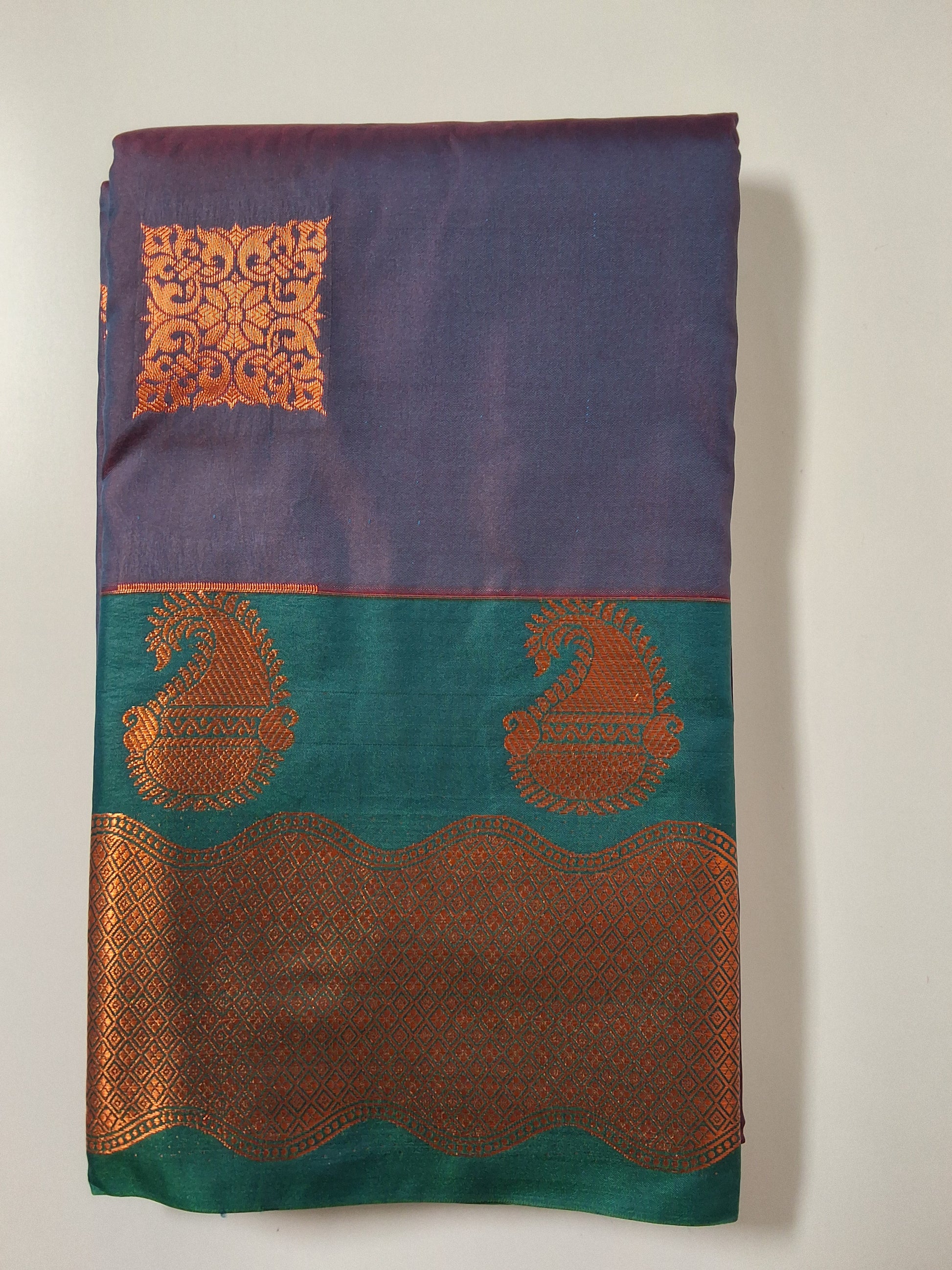 This saree collection comes in five beautiful colors, each featuring rich golden motifs spread across the fabric for a touch of elegance. The border is adorned with intricate gold motifs, adding a luxurious detail to the overall design. The pallu in all sarees is green with detailed patterns, complementing the overall look. Both the blouse and pallu are perfectly color-coordinated, giving the saree a polished and stylish appearance.