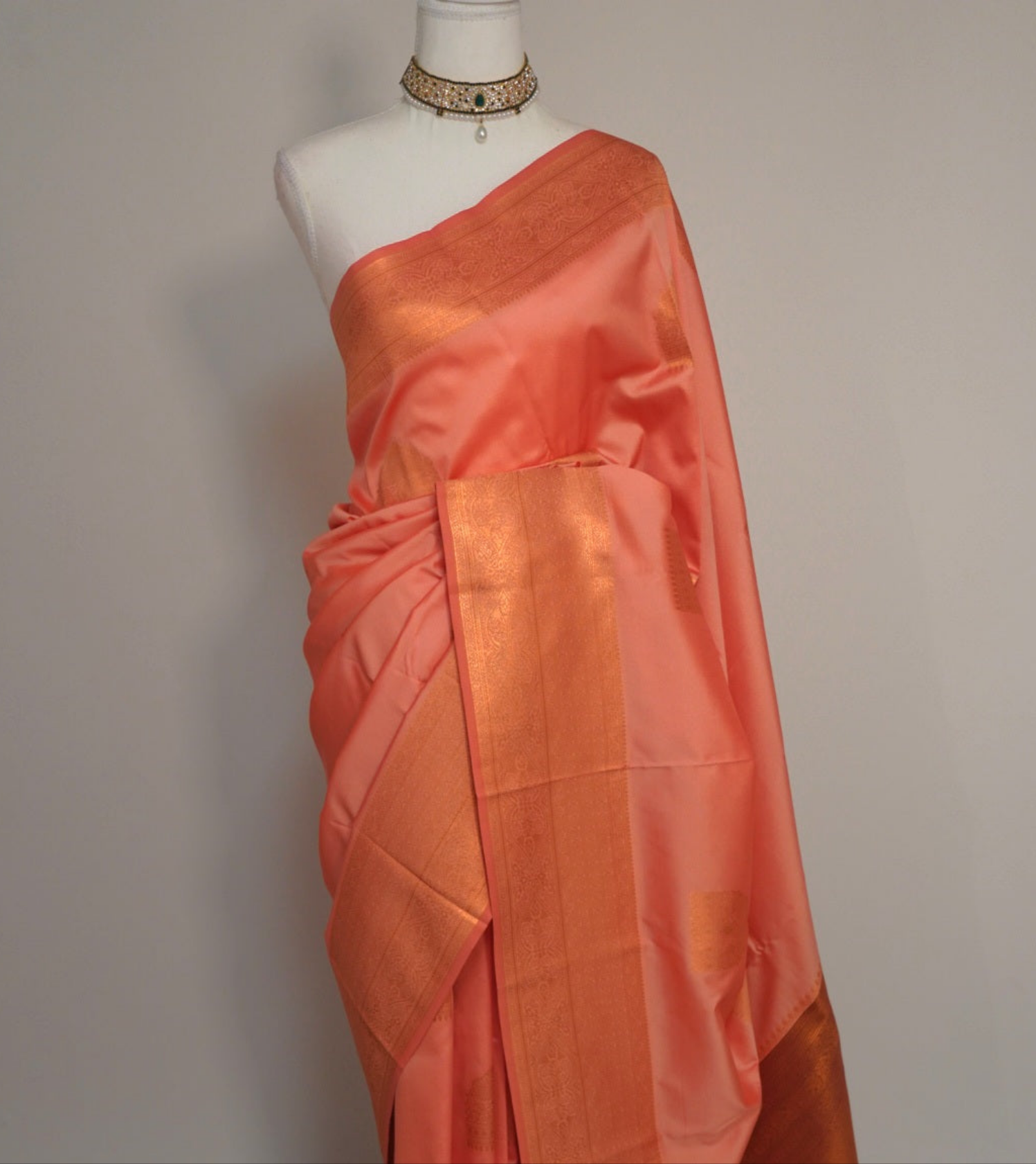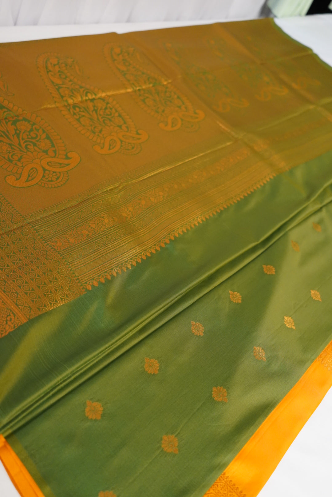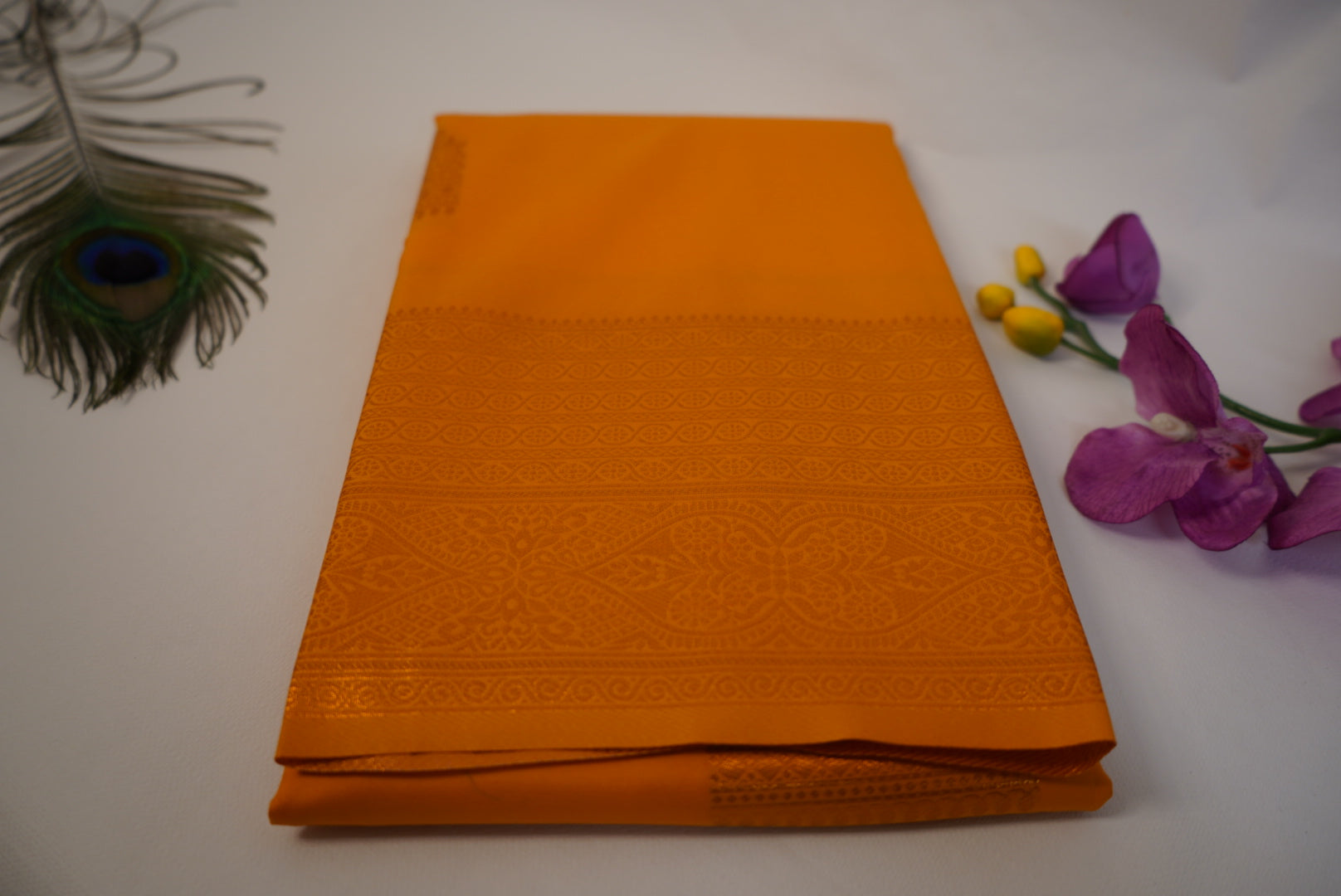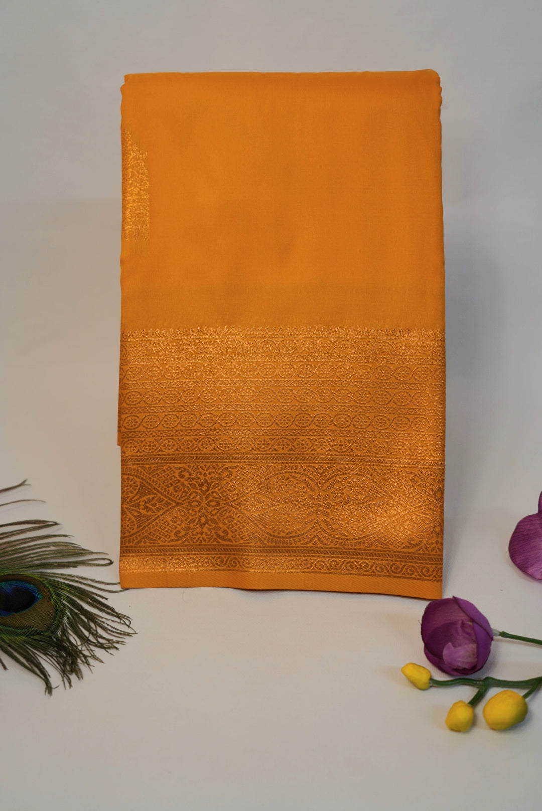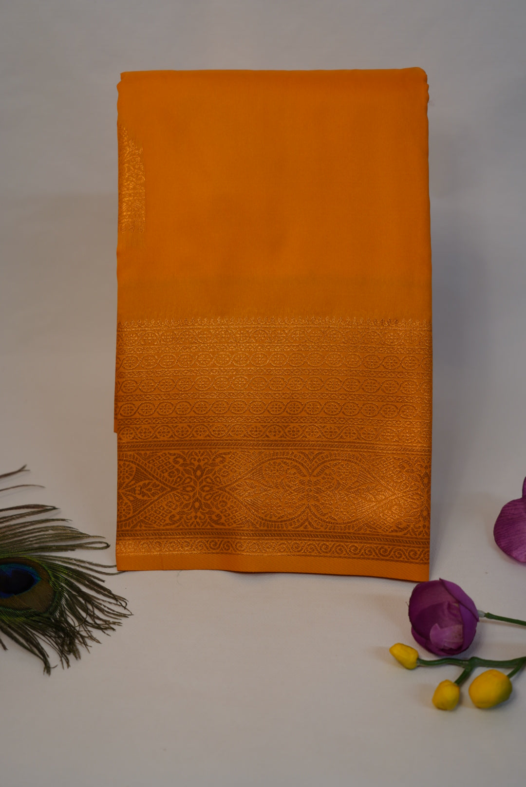 This is a stunning silk saree with a beautiful border and pallu, giving it a rich and elegant look. The saree has a beautiful golden sheen and features fine zari work woven into the borders and pallu, adding a touch of luxury. The body of the saree is kept simple yet classy, allowing the shine and texture stand out. The border features intricate golden motifs, which perfectly complements the bright body. The pallu has gold design, making it look graceful when draped. This saree is ideal for festivals, weddings and special occasions, as it combines rich colors, fine silk, and detailed craftsmanship for a timeless and royal appearance.