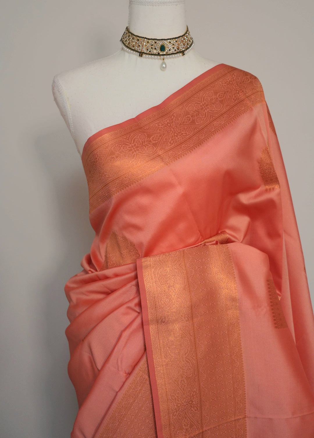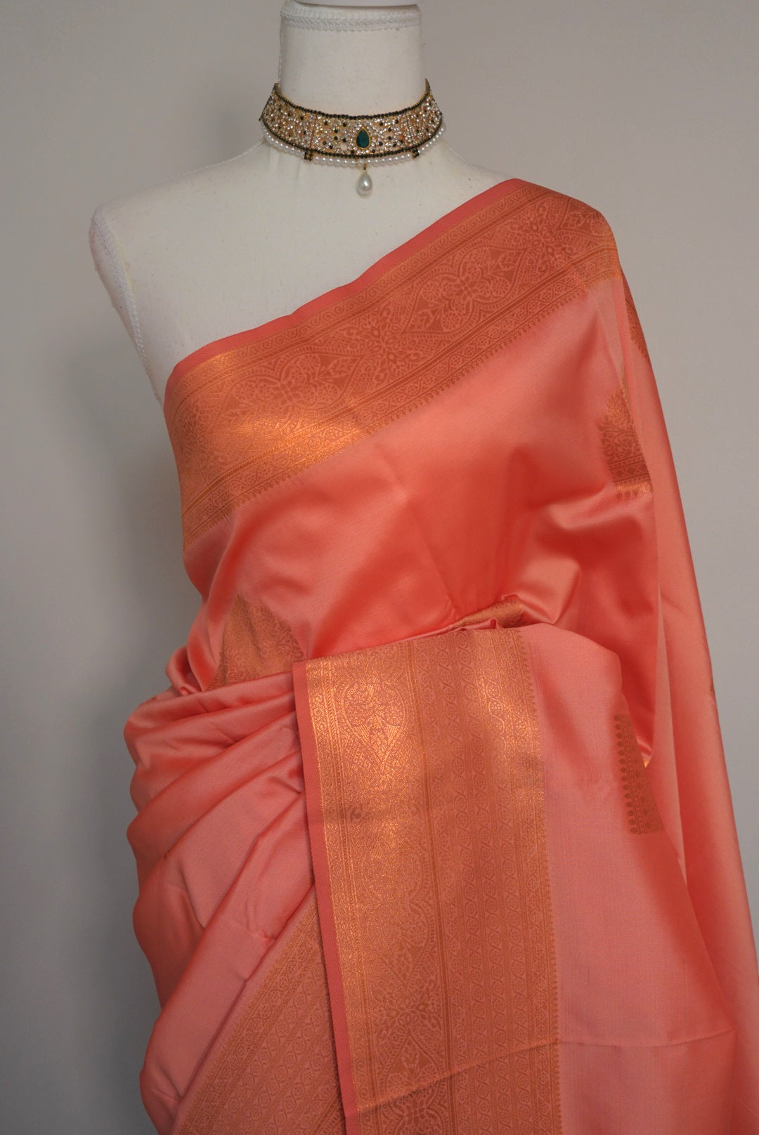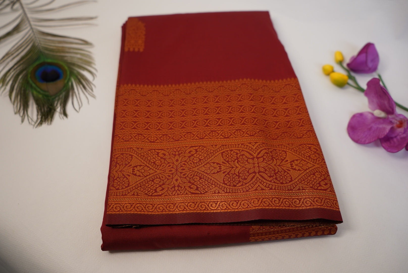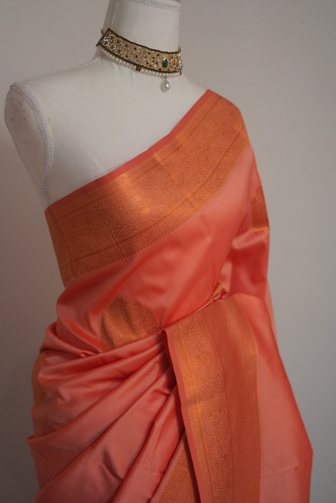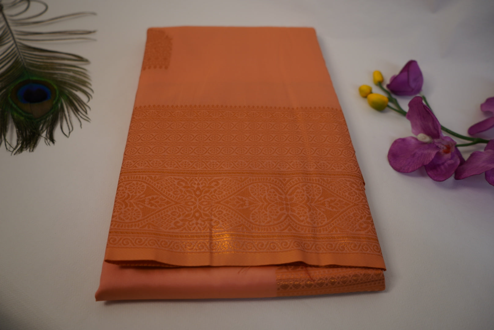 This is a stunning silk saree with a beautiful border and pallu, giving it a rich and elegant look. The saree has a beautiful golden sheen and features fine zari work woven into the borders and pallu, adding a touch of luxury. The body of the saree is kept simple yet classy, allowing the shine and texture stand out. The border features intricate golden motifs, which perfectly complements the bright body. The pallu has gold design, making it look graceful when draped. This saree is ideal for festivals, weddings and special occasions, as it combines rich colors, fine silk, and detailed craftsmanship for a timeless and royal appearance.