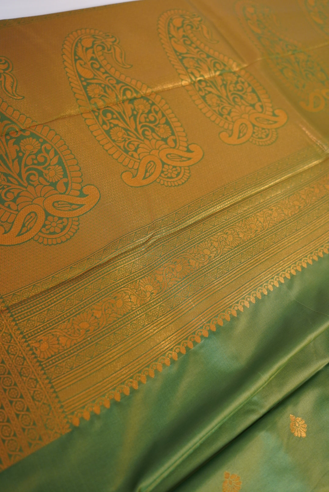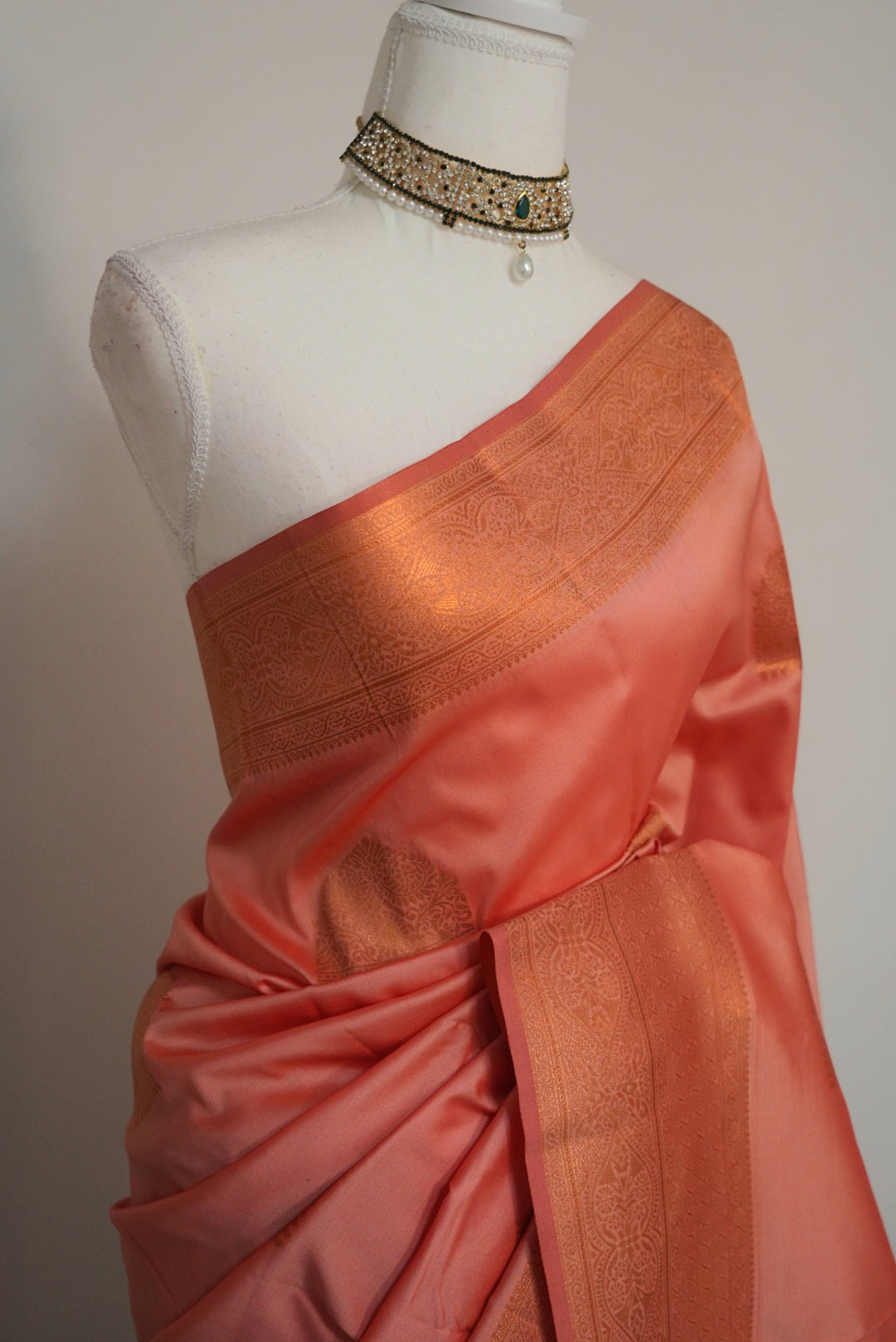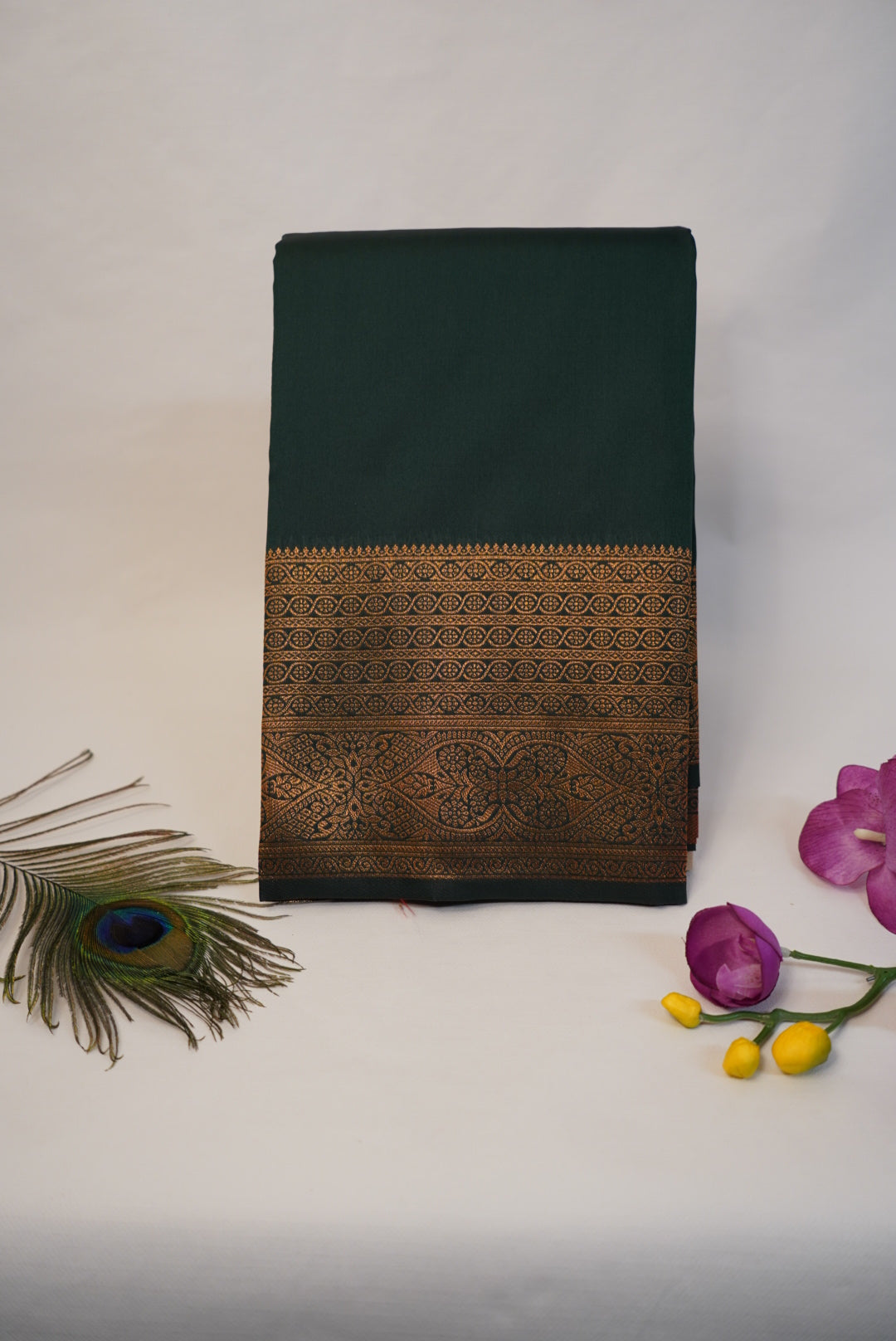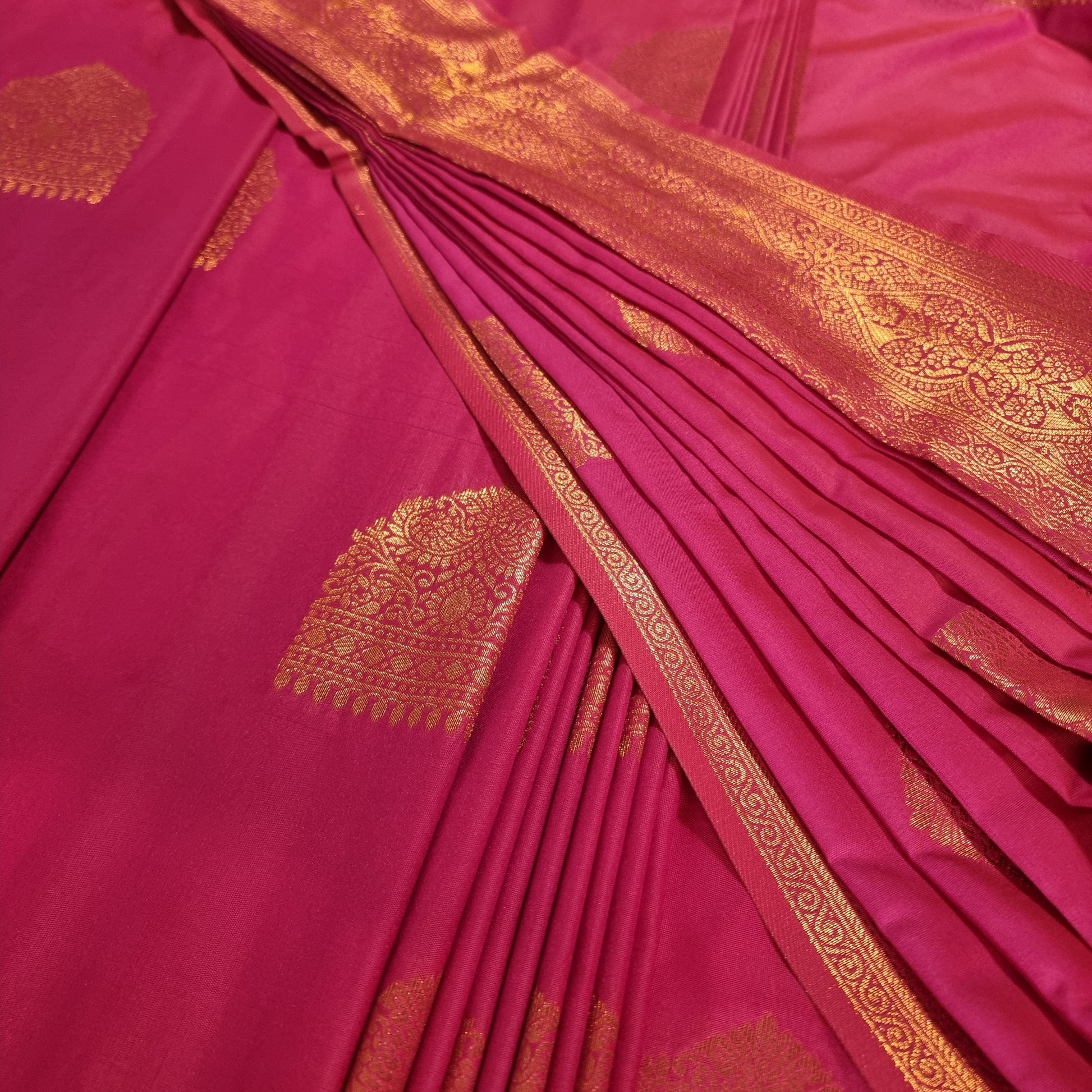 This is a stunning silk saree with a beautiful border and pallu, giving it a rich and elegant look. The saree has a beautiful golden sheen and features fine zari work woven into the borders and pallu, adding a touch of luxury. The body of the saree is kept simple yet classy, allowing the shine and texture stand out. The border features intricate golden motifs, which perfectly complements the bright body. The pallu has gold design, making it look graceful when draped. This saree is ideal for festivals, weddings and special occasions, as it combines rich colors, fine silk, and detailed craftsmanship for a timeless and royal appearance.
