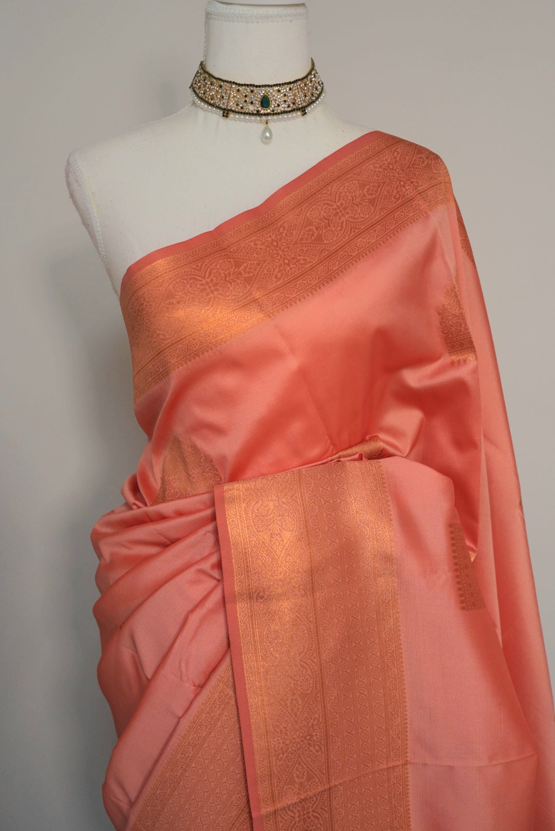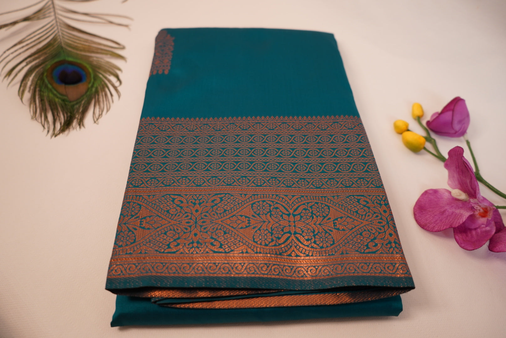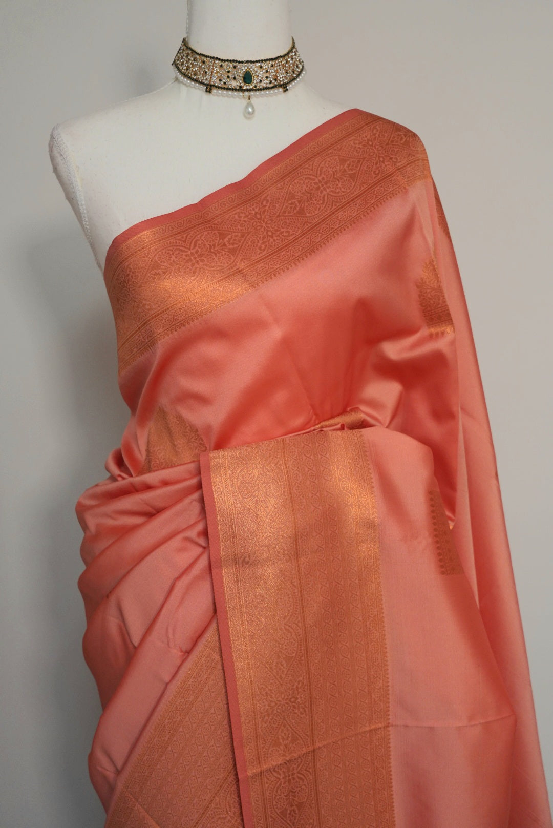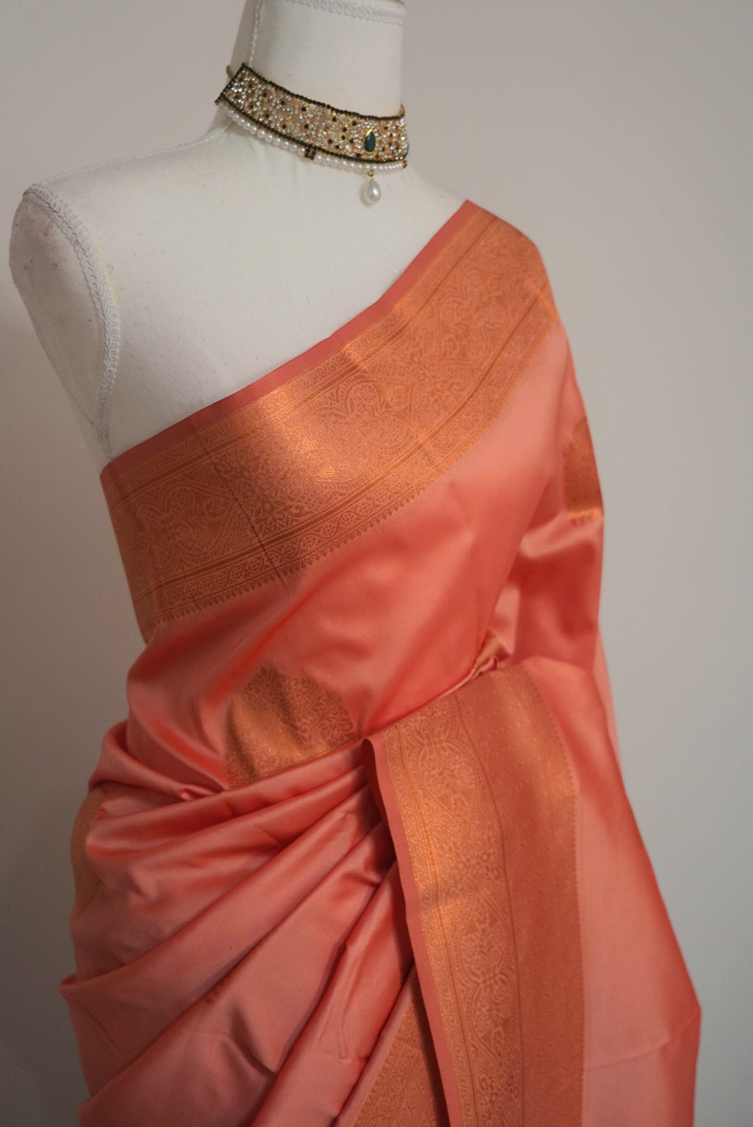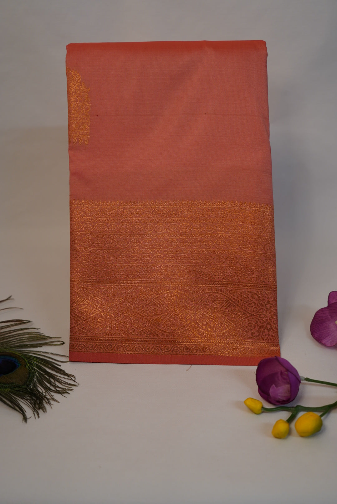 This is a stunning silk saree with a beautiful border and pallu, giving it a rich and elegant look. The saree has a beautiful golden sheen and features fine zari work woven into the borders and pallu, adding a touch of luxury. The body of the saree is kept simple yet classy, allowing the shine and texture stand out. The border features intricate golden motifs, which perfectly complements the bright body. The pallu has gold design, making it look graceful when draped. This saree is ideal for festivals, weddings and special occasions, as it combines rich colors, fine silk, and detailed craftsmanship for a timeless and royal appearance.