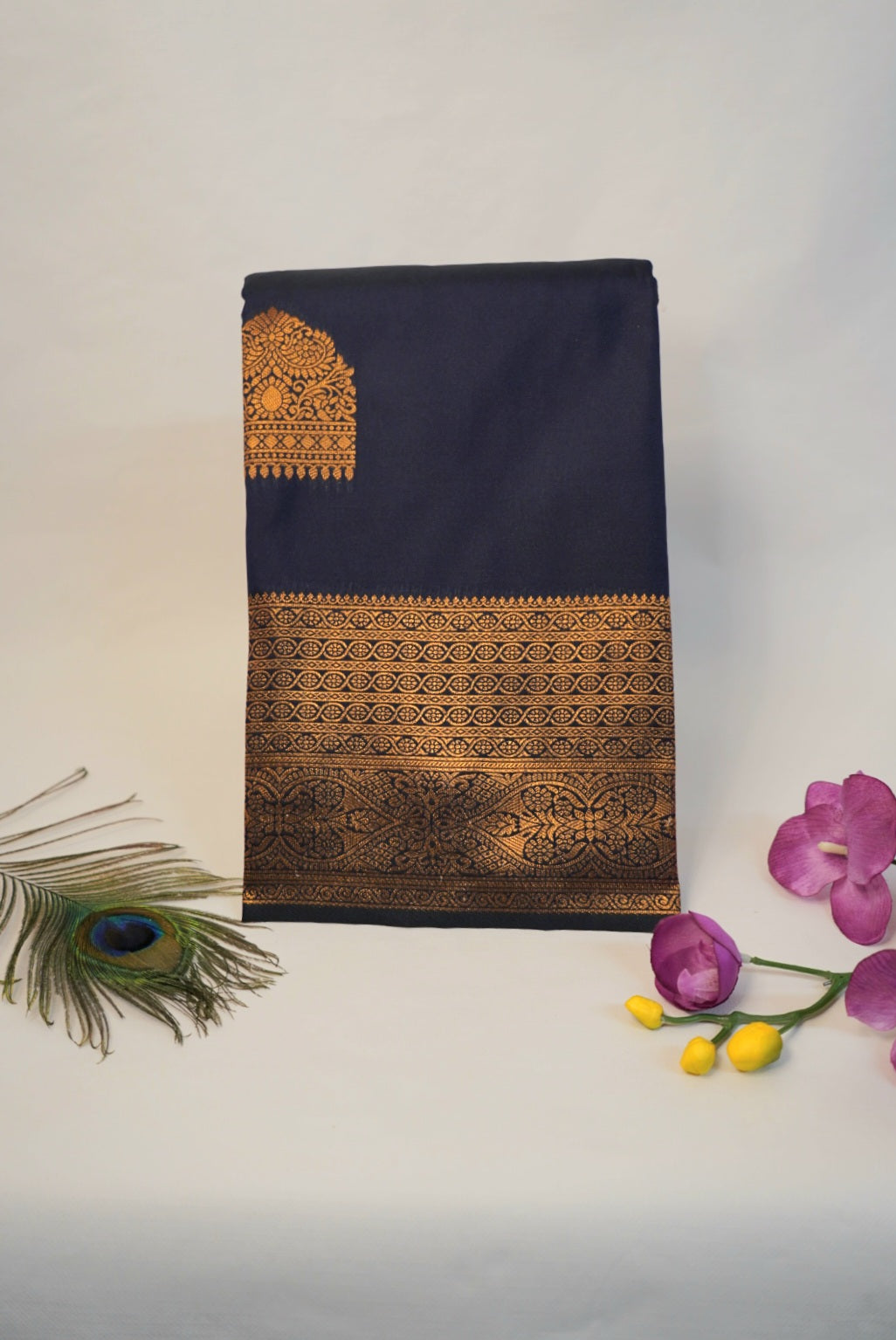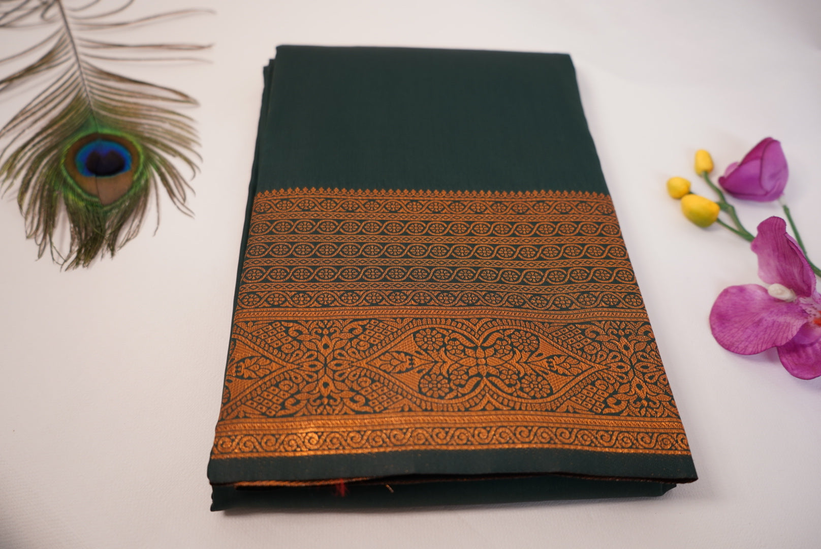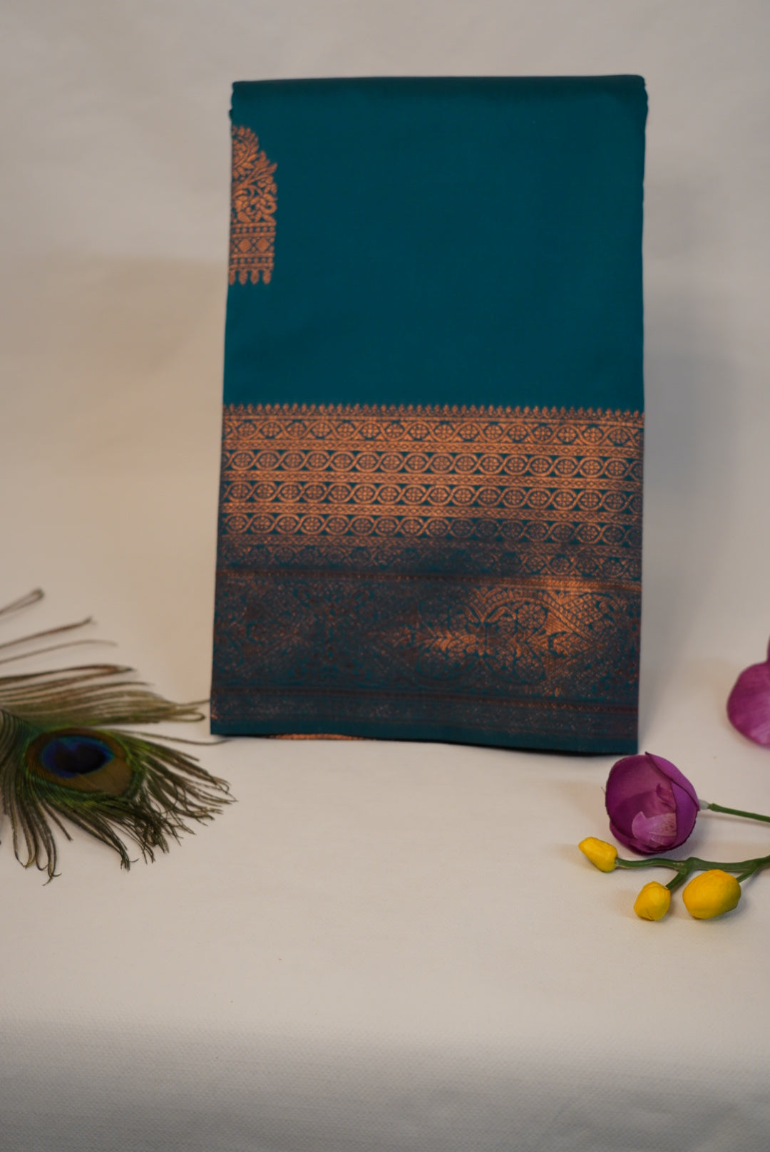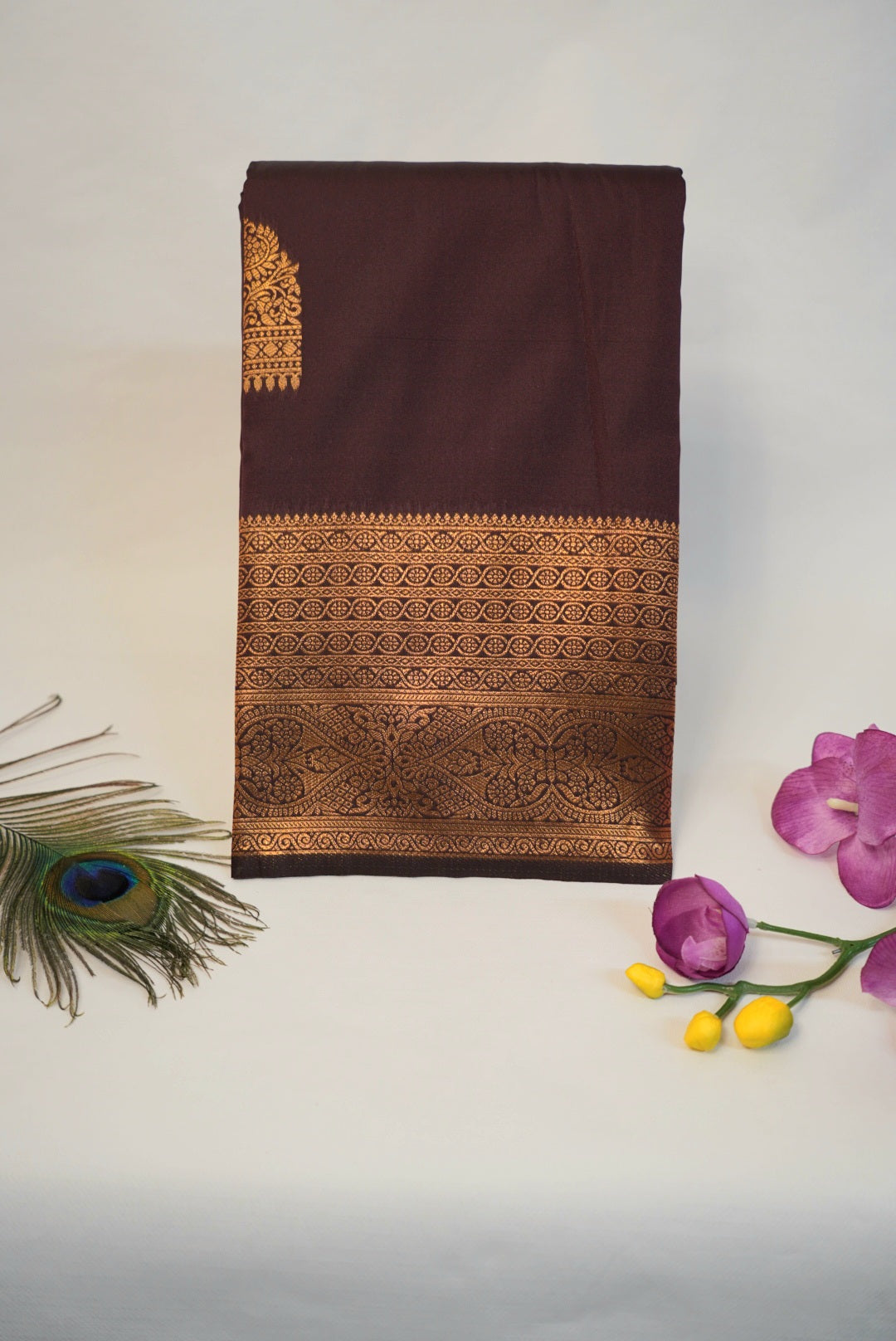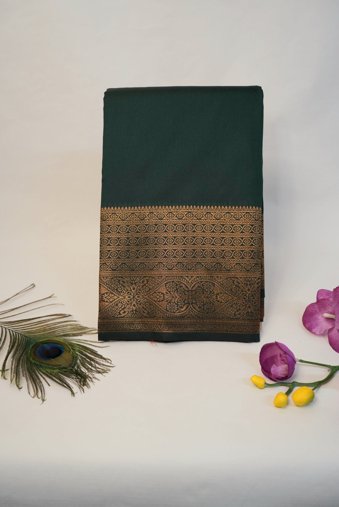 This is a stunning silk saree with a beautiful border and pallu, giving it a rich and elegant look. The saree has a beautiful golden sheen and features fine zari work woven into the borders and pallu, adding a touch of luxury. The body of the saree is kept simple yet classy, allowing the shine and texture stand out. The border features intricate golden motifs, which perfectly complements the bright body. The pallu has gold design, making it look graceful when draped. This saree is ideal for festivals, weddings and special occasions, as it combines rich colors, fine silk, and detailed craftsmanship for a timeless and royal appearance.